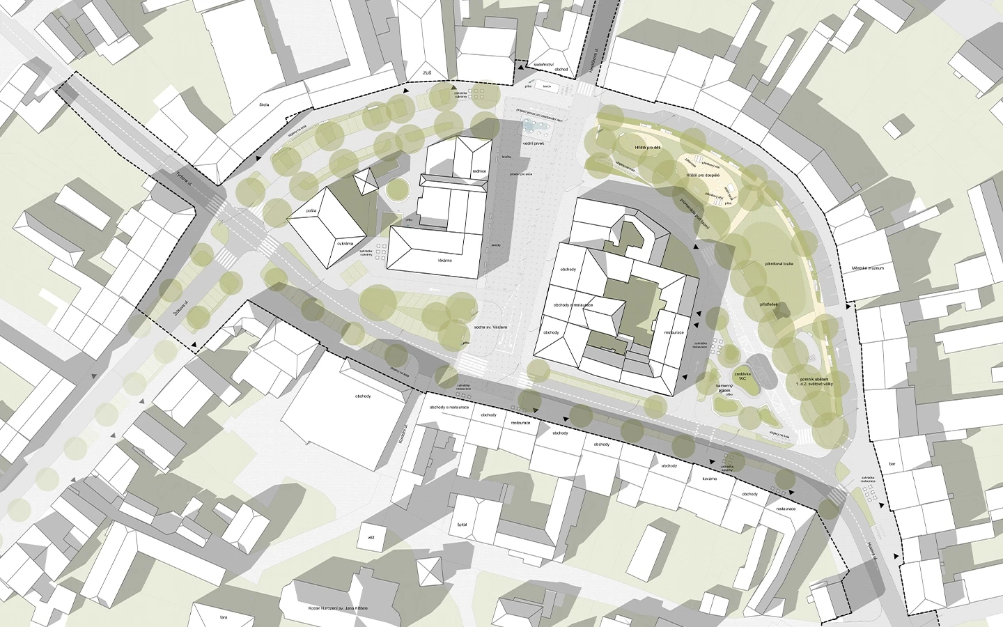 Návrh staví na existujících kvalitách. Kamennou plochu před radnicí upravuje na reprezentativní náměstí s pevnými hranami. Ve východní části vytváří krásný park, ve kterém bude příjemné trávit volný čas. V obchodní ulici je cílem vytvořit široké chodníky pro zahrádky restaurací, stín pod korunami stromů a celkově obchodní třídu, kde budou místní podniky prosperovat. Žižkova ulice bude klidnou, bezpečnou a esteticky upravenou plochou.